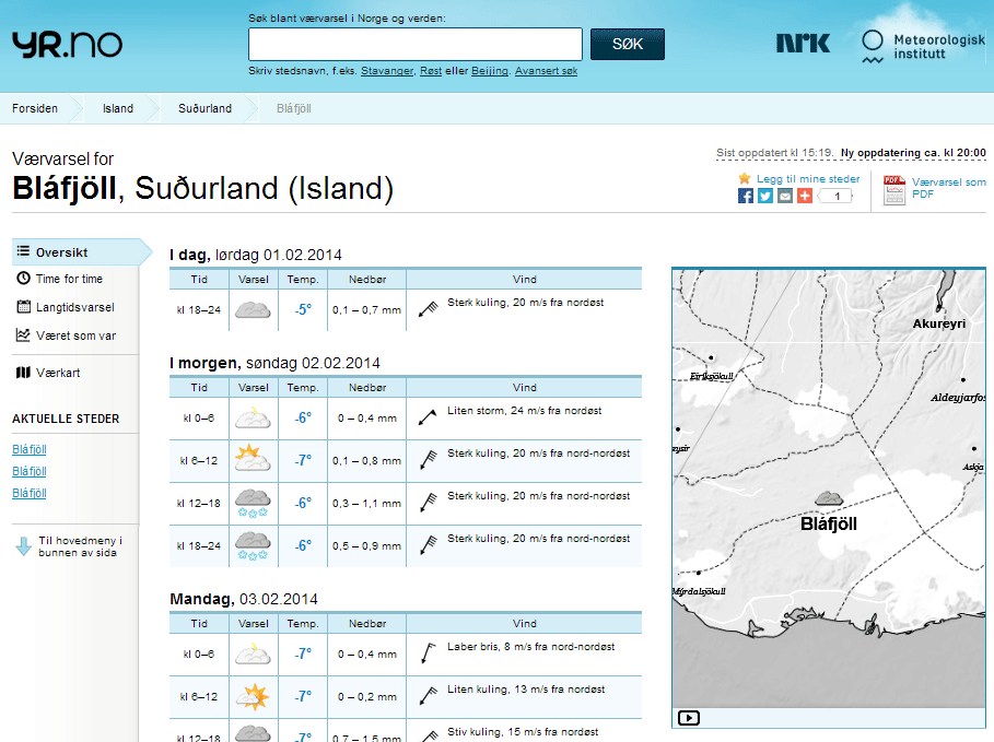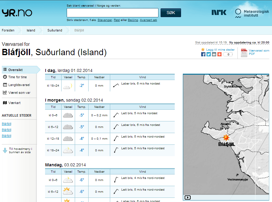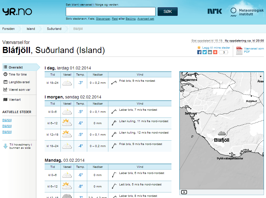 Veðurspár yr.no eru ákaflega vinsælar enda eru þær mjög aðgengilegar og notendum finnst þeir fá nákvæma spá fyrir hvaða stað sem er, setta fram á skýran, myndrænan hátt. En það er samt ekki öruggt að sækja spá fyrir Bláfjöll án þess að gæta sín vel. Í alheimsörnefnabankanum www.geonames.org, sem yr.no styðst við, kemur nafnið Bláfjöll fyrir á fjórum stöðum á Íslandi. Eitt tilvikið er sagt á Norðurlandi eystra og því auðvelt að varast það en hin þrjú eru sögð fjöll á Suðurlandi. Það er ekki alveg ljóst hvernig á að hitta á réttu fjöllin því hver veit hvort okkar Bláfjöll eru númer 2632767, 2632768 eða 3418149? Reyndar er síðasta númerið það rétta og e.t.v. má treysta því að það sé síðast í röðinni. En samt er öruggast að athuga hvort fjöllin lenda á réttum stað á korti sem birtist á yfirlitssíðunni (sést í vafra en ekki á appi) og hvort neðst á þeirri sömu síðu séu myndir úr myndavélum Vegagerðarinnar við vegamótin á Sandskeiði.